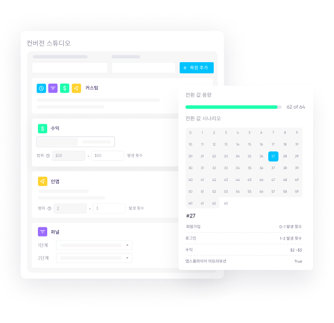 유연한 전환 값 매핑 툴로 SKAdNetwok의 전환 값 측정 기능 활용도를 극대화합니다.