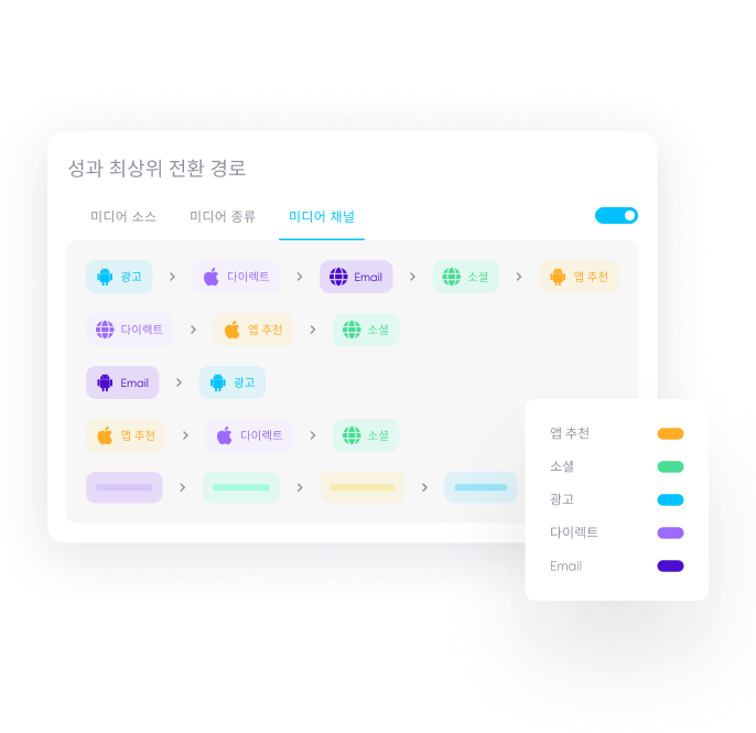 캠페인을 최적화하려면 어떤 고객 여정이 가장 높은 수익을 창출하는지 알아야 합니다. 앱스플라이어는 고객 여정을 따라 모든 모바일 및 웹 터치포인트를 측정하여 전환 경로를 분석해 캠페인 효율을 극대화하도록 지원합니다.