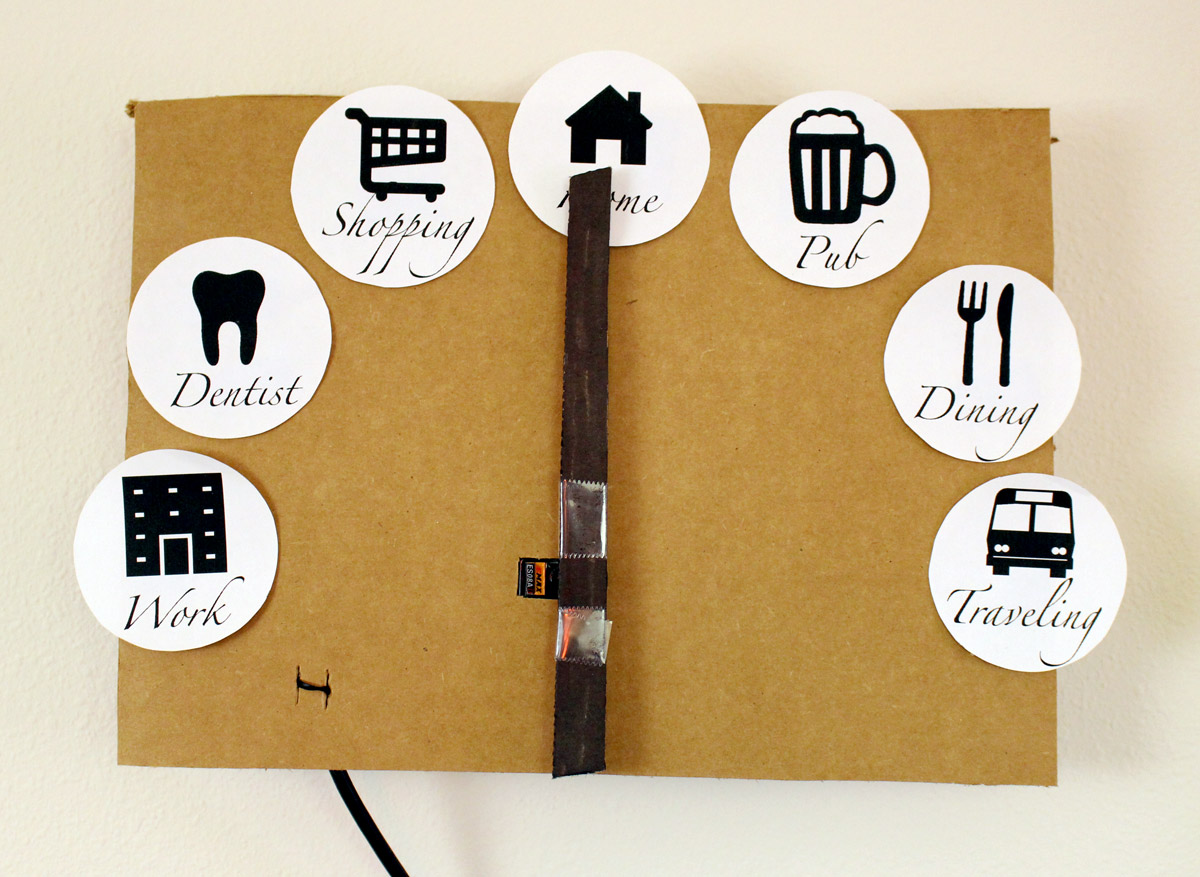 I have a "magic clock" in my house that points to where I am. "Home," "Work" and "Traveling" are based on my GPS location. The others are based on Foursquare checkins.
