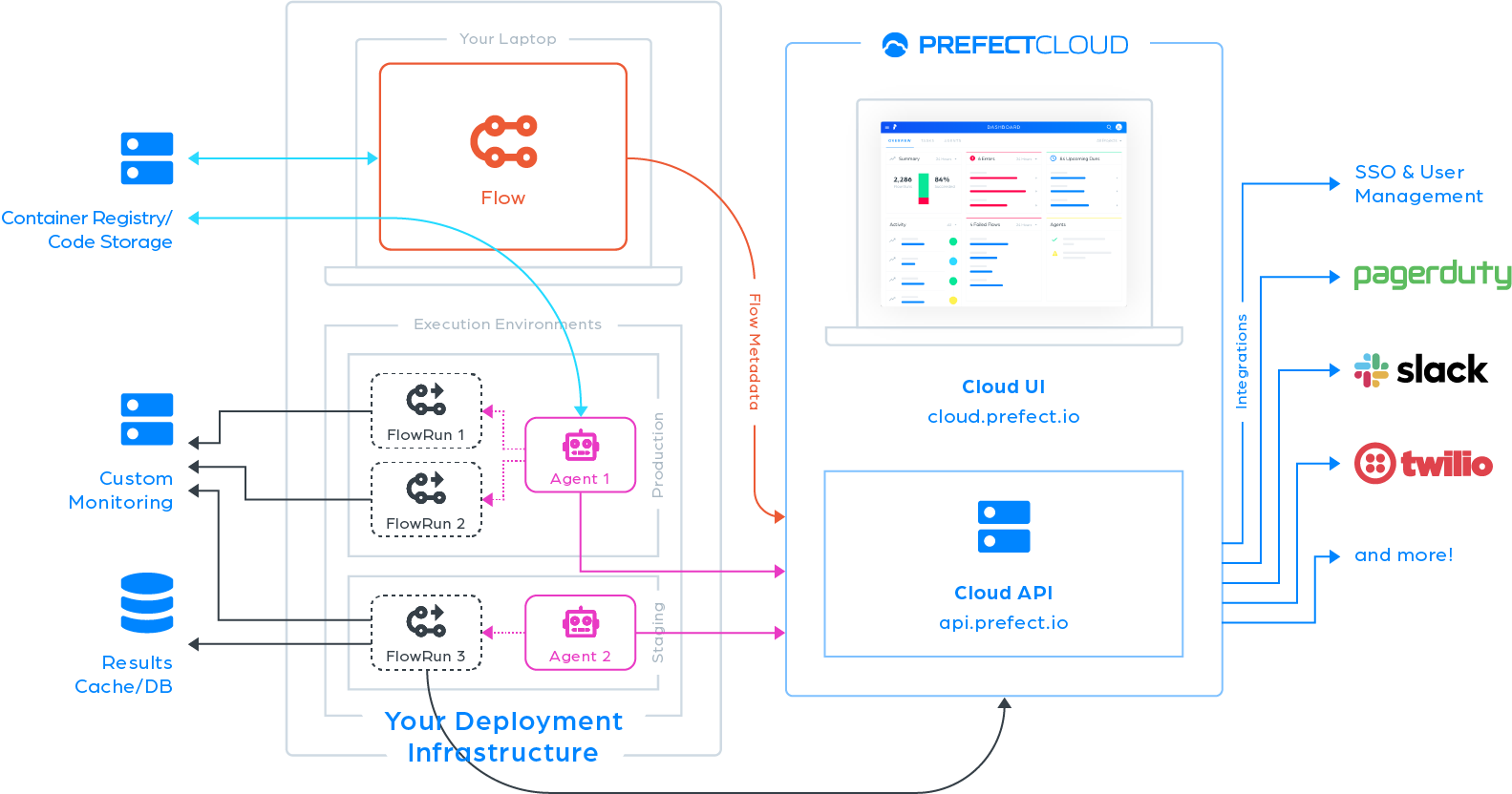 Prefect's unique hybrid execution model keeps your code and data completely private while taking full advantage of our managed orchestration service.