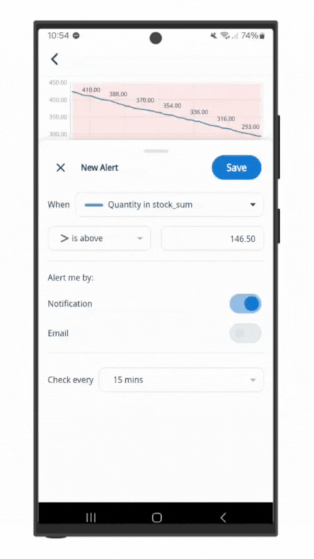Tap on a graph and click the three dots on the top right of the screen. Select ‘Create new alert’.