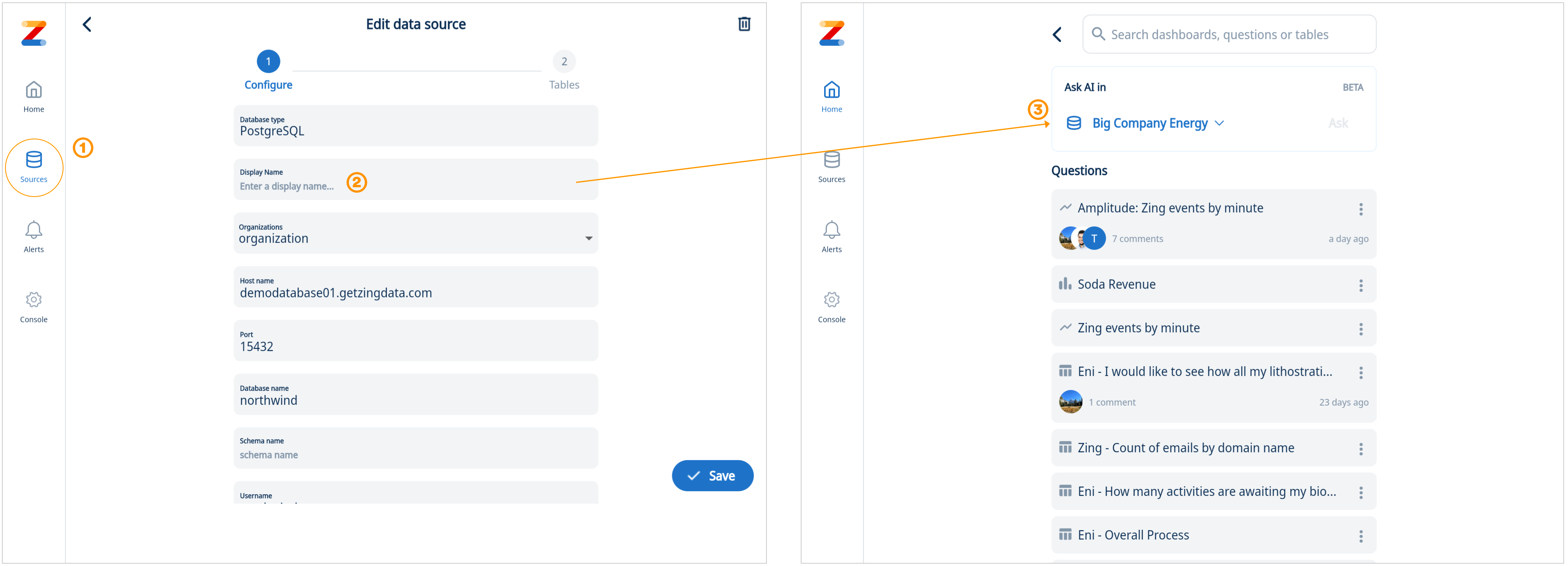 Note: You can set up multiple data sources with an organization, even across data source types. Zing will show the tables and views across data sources in the app.