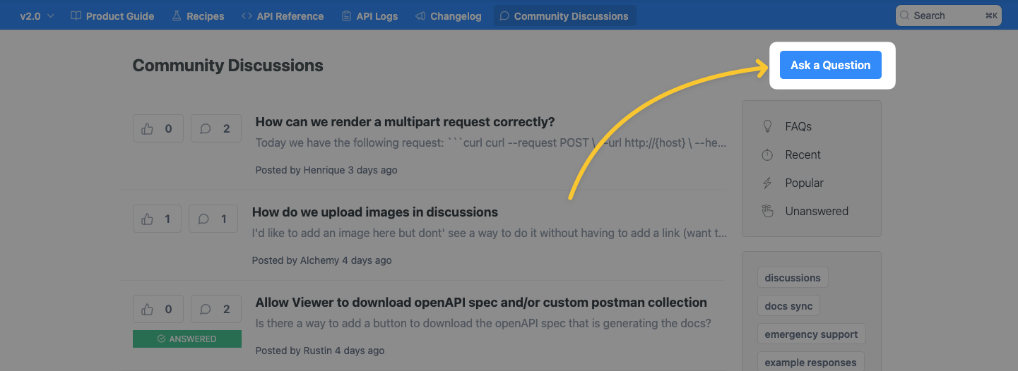 - To ask a new question, click on the Ask a Question button. This requires the user to sign-in or sign-up for a ReadMe account.