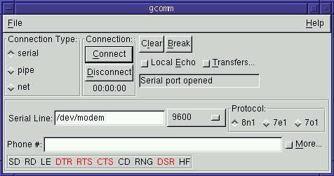 Here is another snapshot of gcomm with the serial port "more detail" panel open and the file transfer panel open: