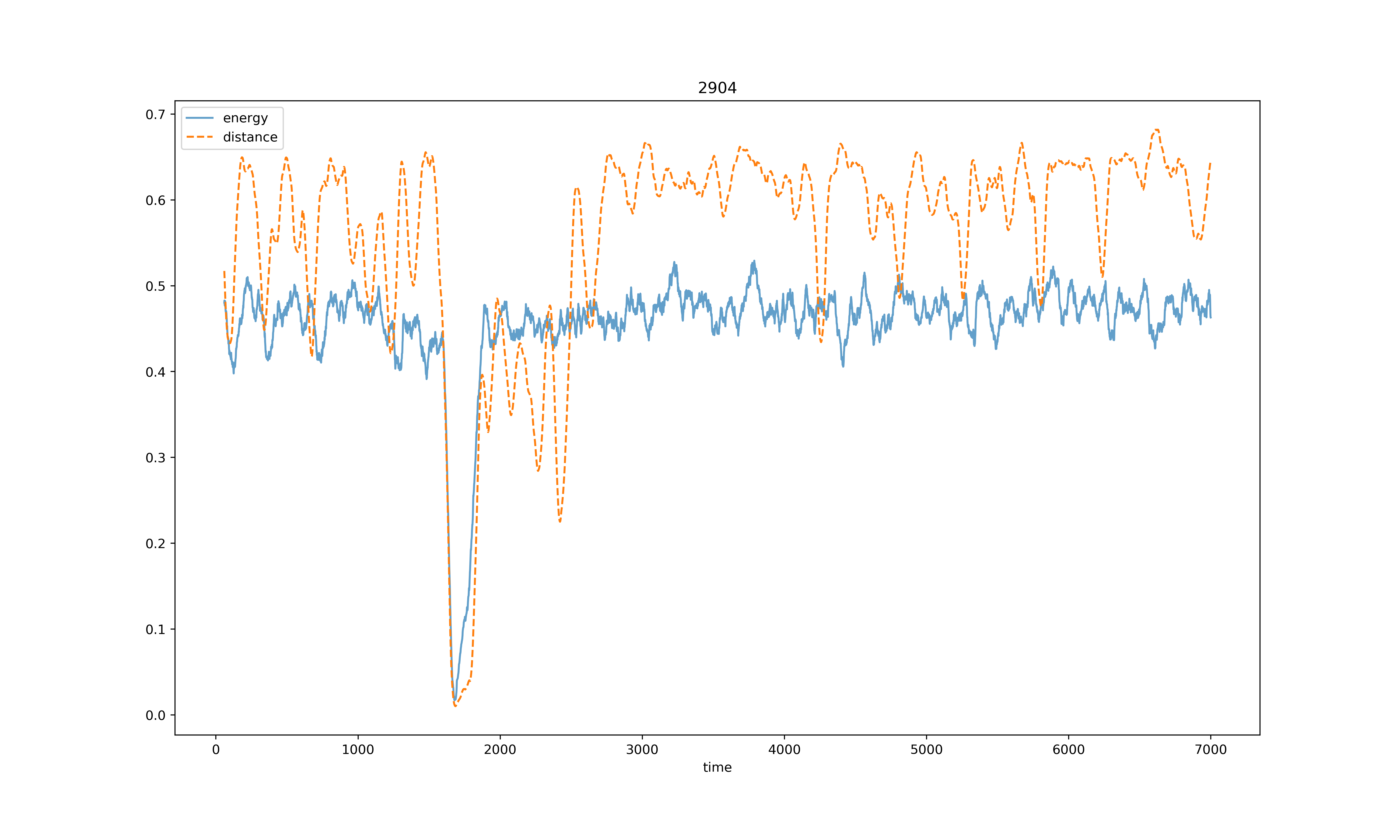 the run labeled '2904': the energy drops, then suddenly rises again. I was very happy: that was my final goal for this project! I then inspected