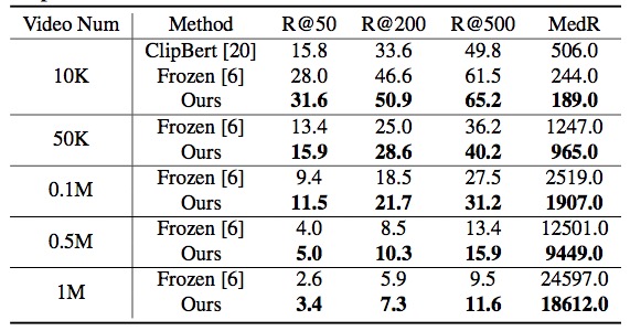 3. Experiments of zero-shot text-to-video retrieval on the large-scale HowTo100M.