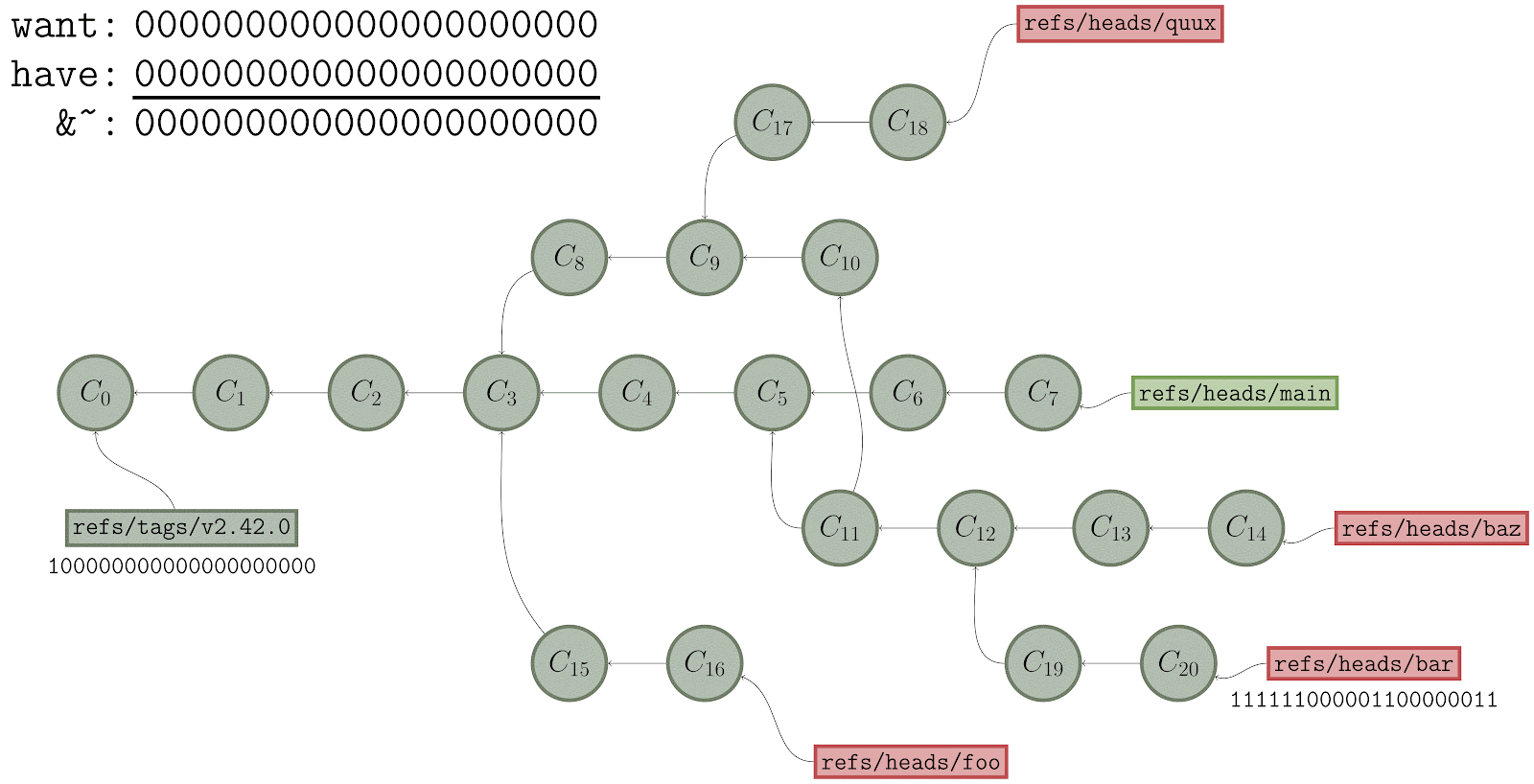 ), we walk along the commit graph, marking each of the corresponding bits in ourhave