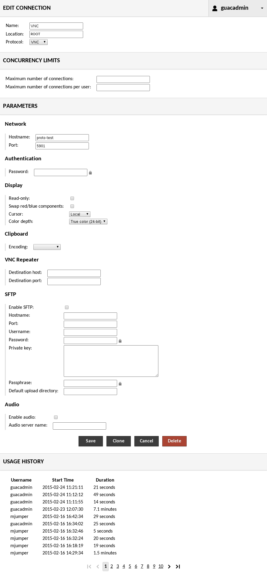 Once you click "Save", the new object will be added, but will initially only be usable by administrators and your current user. To grant another user access to the new connection or connection group, you must edit that user or a user group that the user is a member of, checking the box corresponding to the connection or connection group you created.