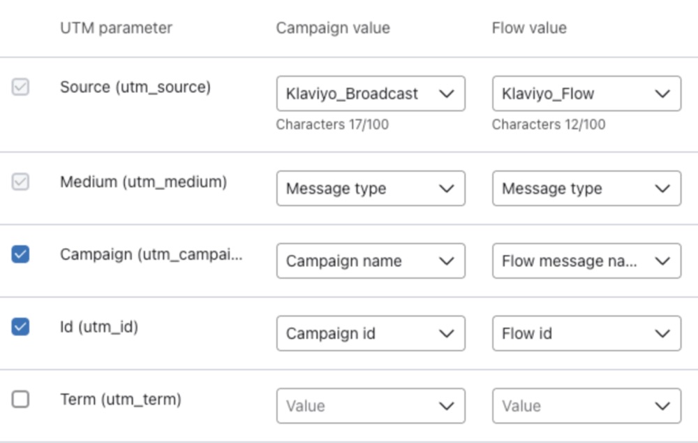 There are 2 default UTM parameters that are always turned on: utm_source and utm_medium. In addition to these two, Google Analytics accepts an additional three parameters by default: utm_campaign, utm_id, and utm_term. Toggle these parameters on or off in Klaviyo as you wish.