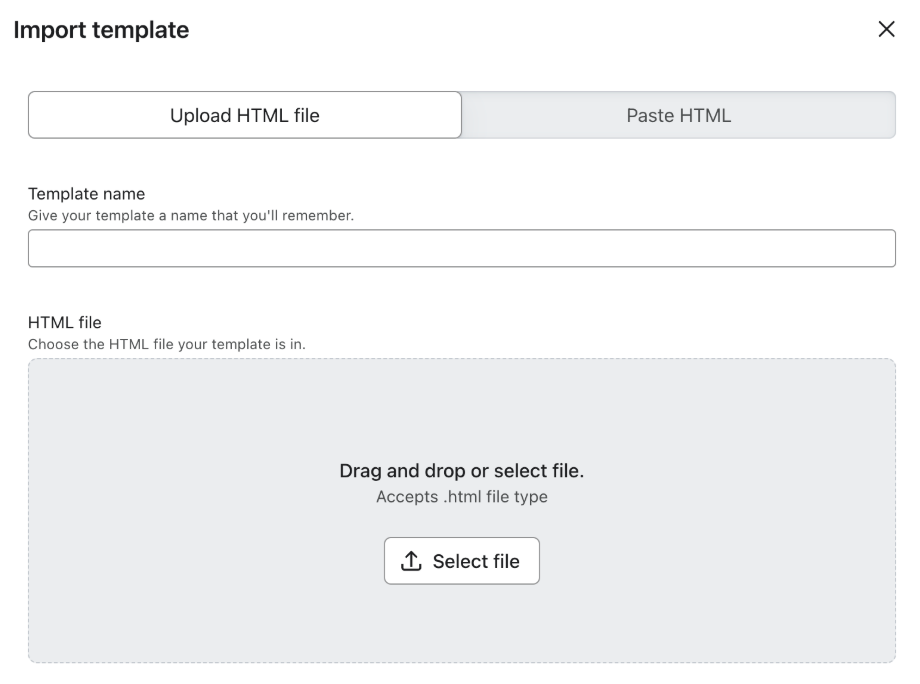 - In the Import template modal, select the HTML file from your computer to upload the file you just saved.