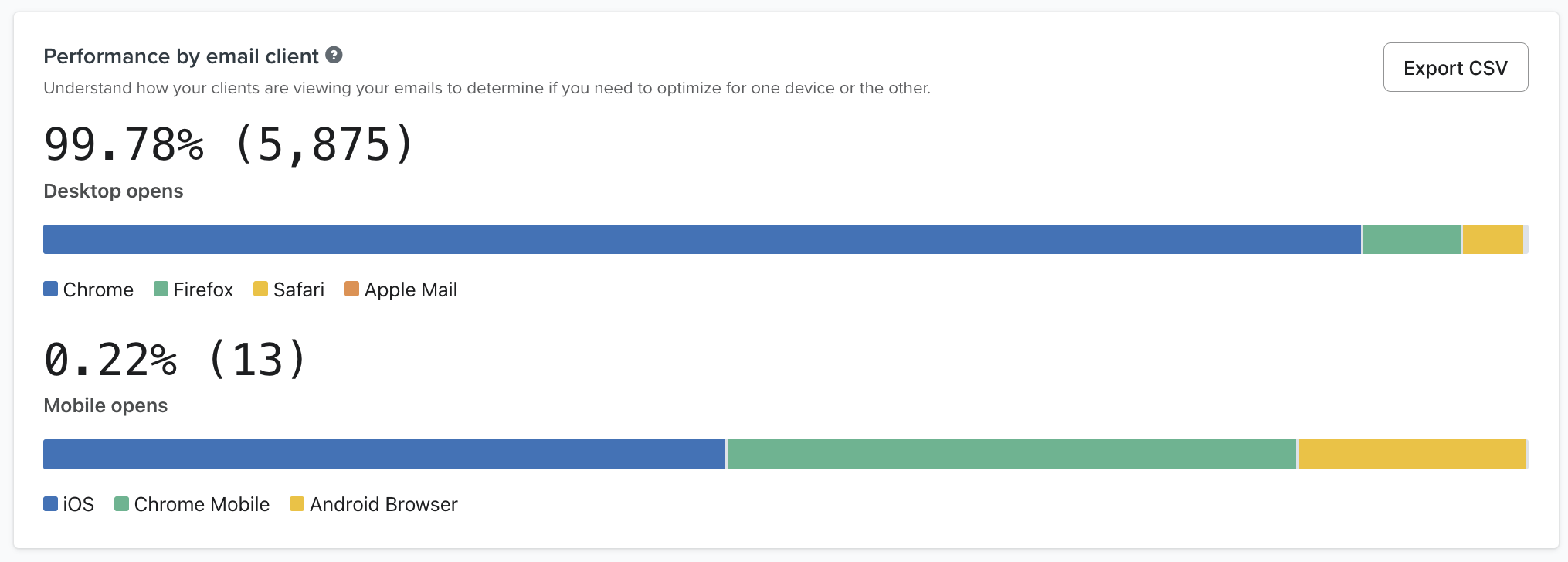 Note that customers' email client is hidden when emails are opened with Apple Mail Privacy Protection (MPP). Open data may be skewed towards desktop if you have many customers using MPP.
