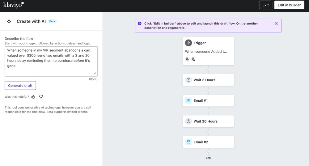 - If you’re happy with the draft, click Edit in builder in the top right. Otherwise, revise your input and click Generate draft again.