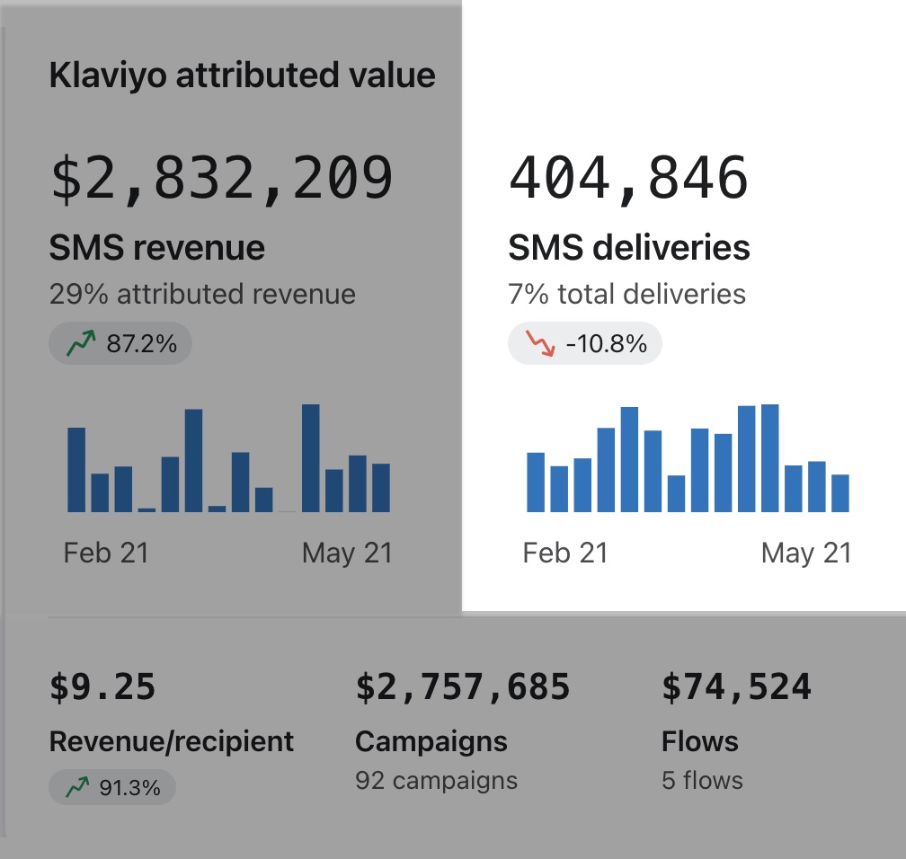La tarjeta de valor atribuido a Klaviyo (KAV ) (valor atribuido a Klaviyo (KAV)) muestra los ingresos o la conversión atribuidos (según elijas ingresos o no ingresos métricos). Aquí puedes ver un desglose del éxito global de tu canal SMS en relación con los ingresos, la entrega, los ingresos por destinatarios y en un desglose de campañas frente a flujo.