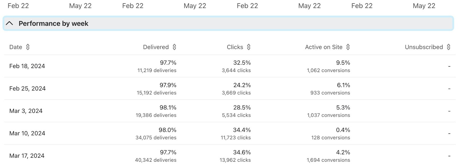 Haz clic para abrir la sección Rendimiento por para revisar la tarjeta métrica con más detalle por día, semana o mes (dependiendo de lo largo que sea tu periodo de tiempo). Puedes revisar cómo se alinean la entrega, los clics, tu conversión métrica y cancelar la suscripción con las cifras totales y los porcentajes que representan.