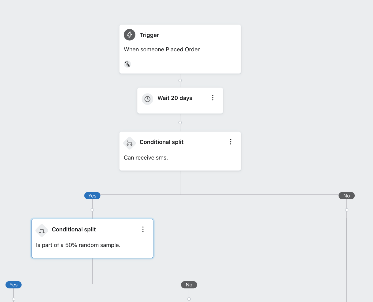 Los flujos de reposición ayudan a la gente a desarrollar el hábito de volver a comprarle. Para convertir a los clientes esporádicos en clientes habituales, puede dividir el flujo y sus mensajes, tal vez ofrecer un descuento.