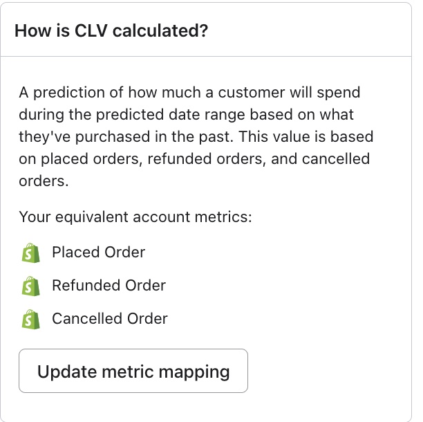 - En la parte superior de esta tarjeta de configuración, puede ver cómo se calcula actualmente su valor de vida del cliente (es decir, Pedidos realizados, Pedidos reembolsados y Pedidos cancelados métrica). Si no dispone de datos suficientes para alguna de estas 3 métricas, no verá aparecer esa(s) métrica(s) en concreto.
