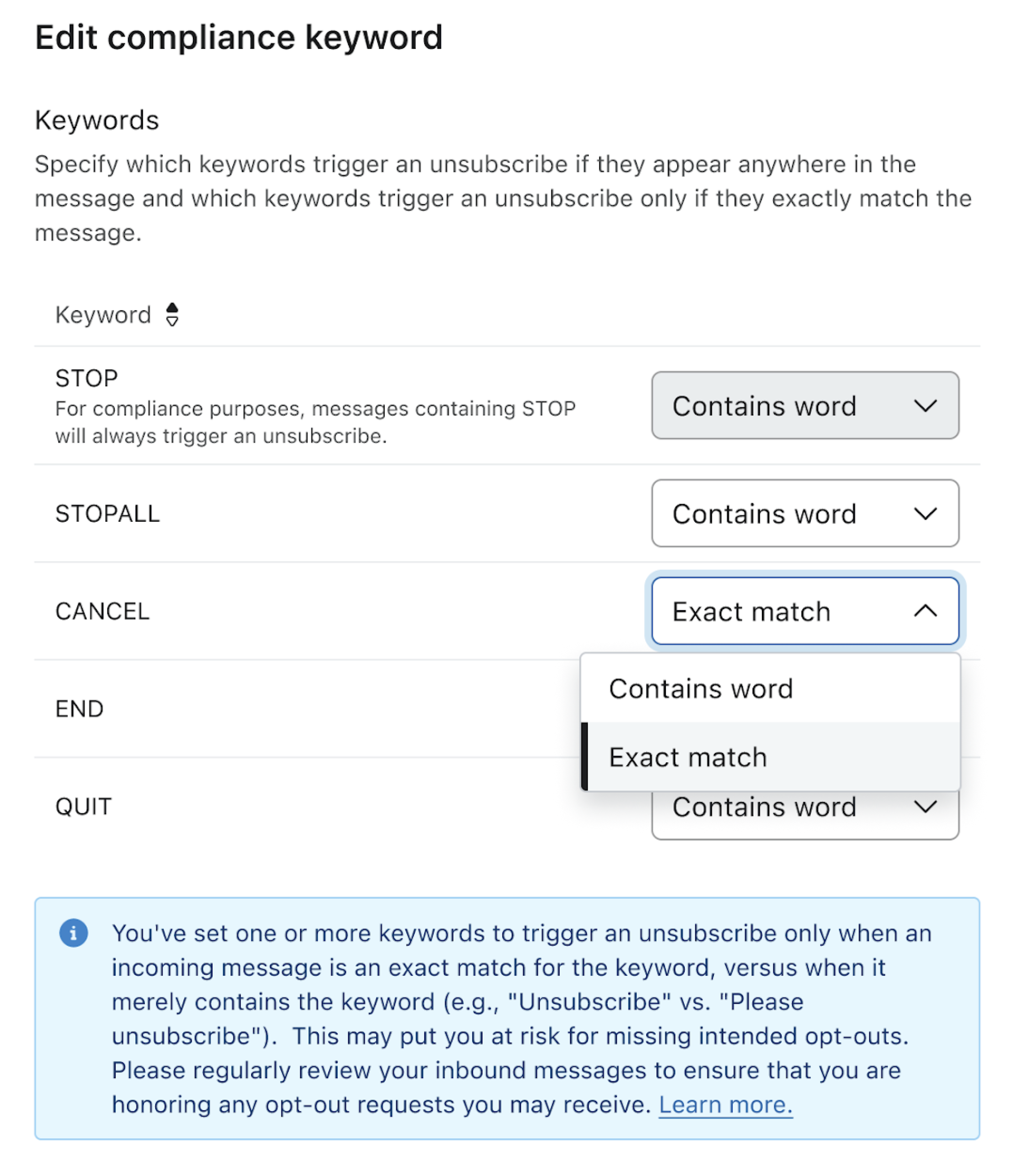 - Para cualquier suscriptor de EE.UU., no puede establecer la palabra clave STOP en Coincidencia exacta.