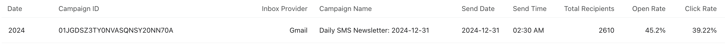 Chaque ligne de votre rapport présentera des données par segment (c.-à-d. l'ID de la campagne) et par envoi de campagne (c.-à-d. l'ID de la campagne et le nom de la campagne), avec l'indicateur de rapport correspondant supplémentaire. -