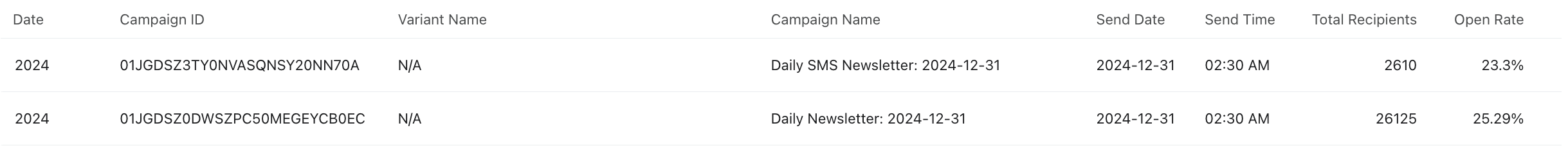 Notez que les campagnes sans variante afficheront "N/A" dans la colonne variante.