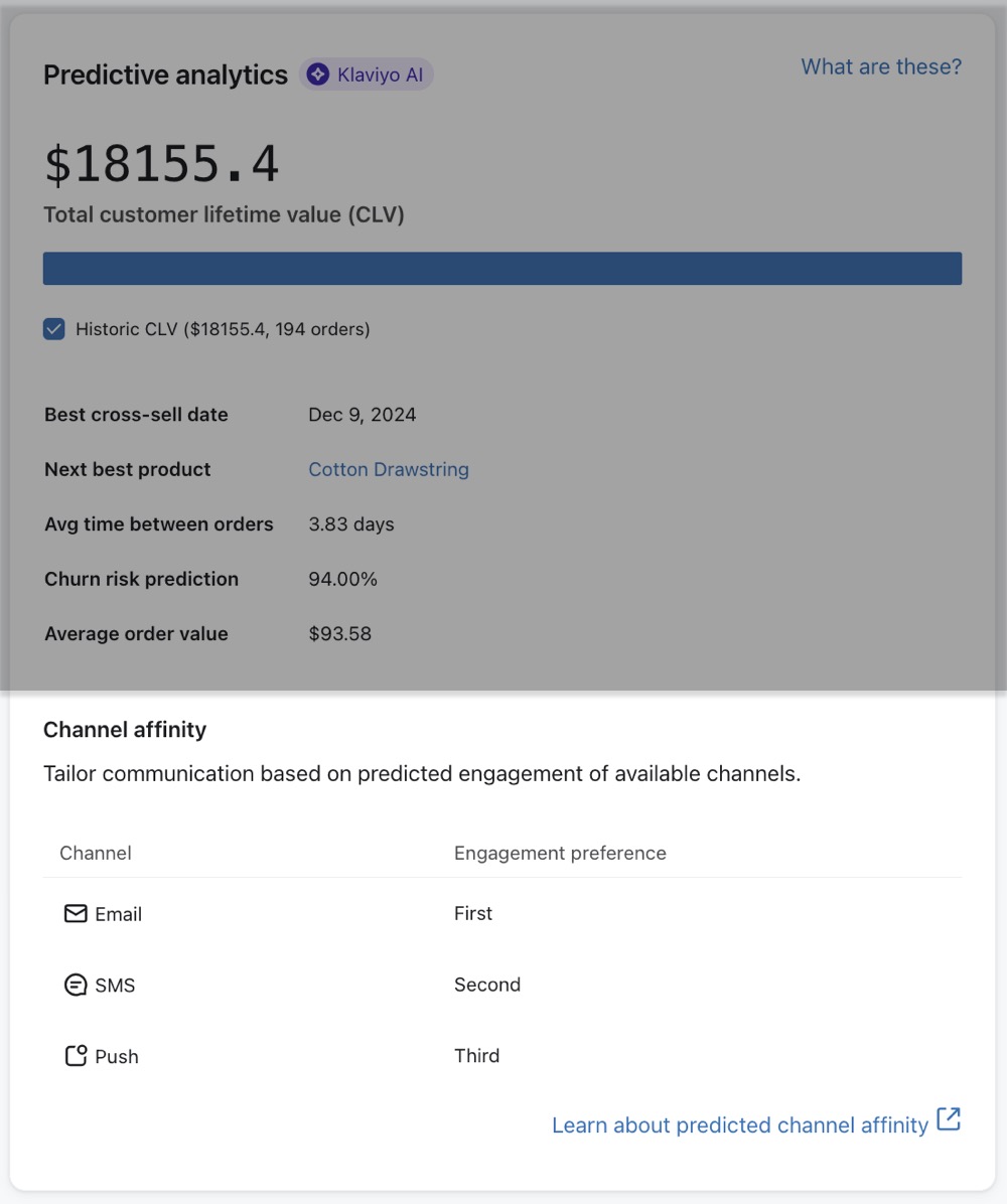 - Si vous êtes éligible, Klaviyo générera un modèle de prédiction et remplira profil avec les propriétés d'affinité des canaux. L'affichage des résultats peut prendre jusqu'à un jour.