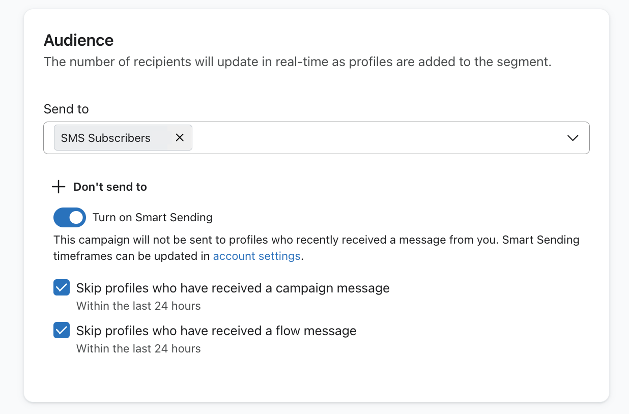 Indipendentemente dal fatto che stia inviando una campagna o impostando un flusso, dia priorità ai suoi abbonati agli SMS quando invia messaggi su entrambi i canali. Anche se i suoi abbonati alle e-mail sono importanti e non vanno trascurati, dare un numero di telefono è più personale di un'e-mail. Pertanto, in genere è meglio trattare gli abbonati agli SMS con maggiore attenzione e preferenza.