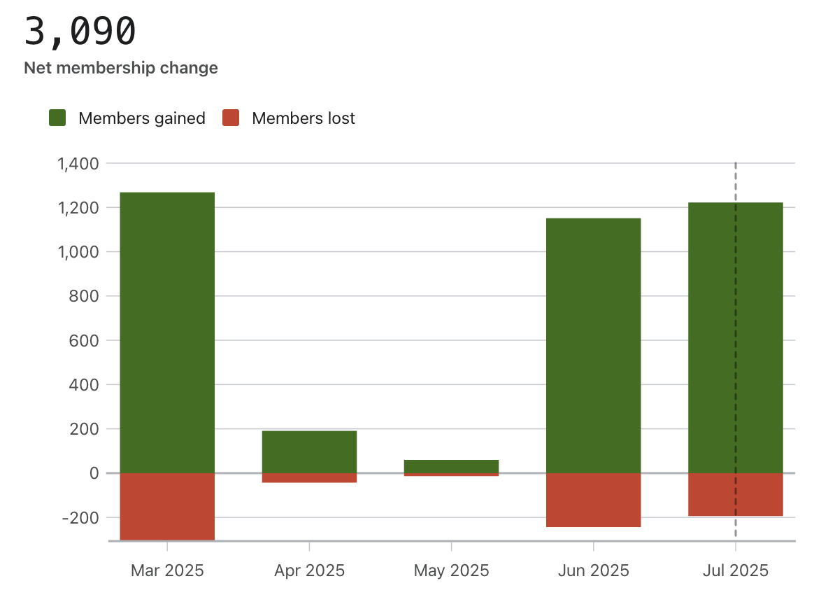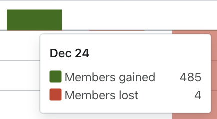 Além disso, ao passar o mouse sobre uma barra no gráfico, aparecerá uma janela pop-up que fornece a quantidade de membros ganhos e perdidos durante esse momento específico.