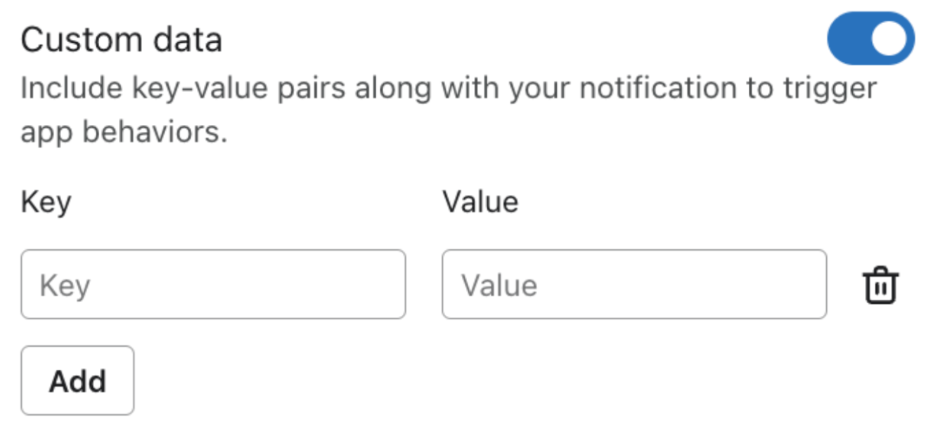 - Em Dados personalizados, o senhor pode incluir pares de valores-chave junto com a notificação para acionar comportamentos do aplicativo tanto da notificação push padrão quanto da silenciosa. O senhor pode adicionar até 10 pares de valores-chave por Push. Saiba mais sobre pares de valores-chave.