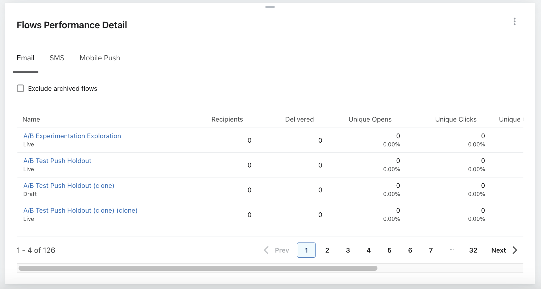 Se o senhor abrir o menu suspenso All E-mail fluxo, All Fluxo de SMS ou All Push para celularfluxodropdown, poderá refinar ainda mais sua visualização, vendo todos os fluxos ou um fluxo específico. O senhor também pode clicar na caixa de seleção Excluir fluxo de rascunho ao lado desse menu suspenso, para excluir qualquer fluxo atualmente em modo de rascunho da exibição em seus dados.