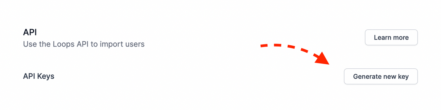 To get started, you’ll need an API key. Go to Settings -> API in Loops and click Generate key.