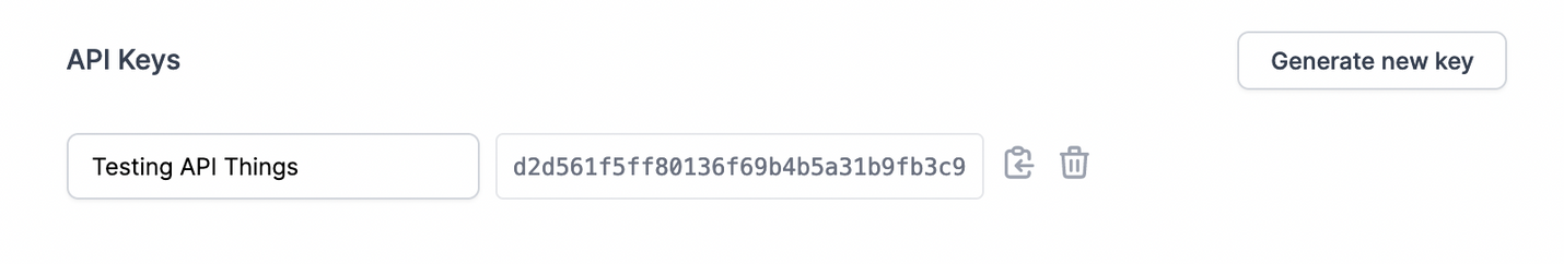 We suggest using a different API key for different purposes. You can revoke an API key at any time with the trash icon.When making an API call, add an Authorization header and set the API key as a Bearer token: