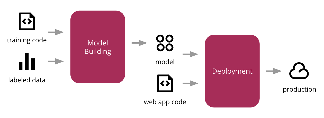 , to package a new combined artifact that contains the model and the application as a Docker image, and to deploy them to a Kubernetes production cluster.