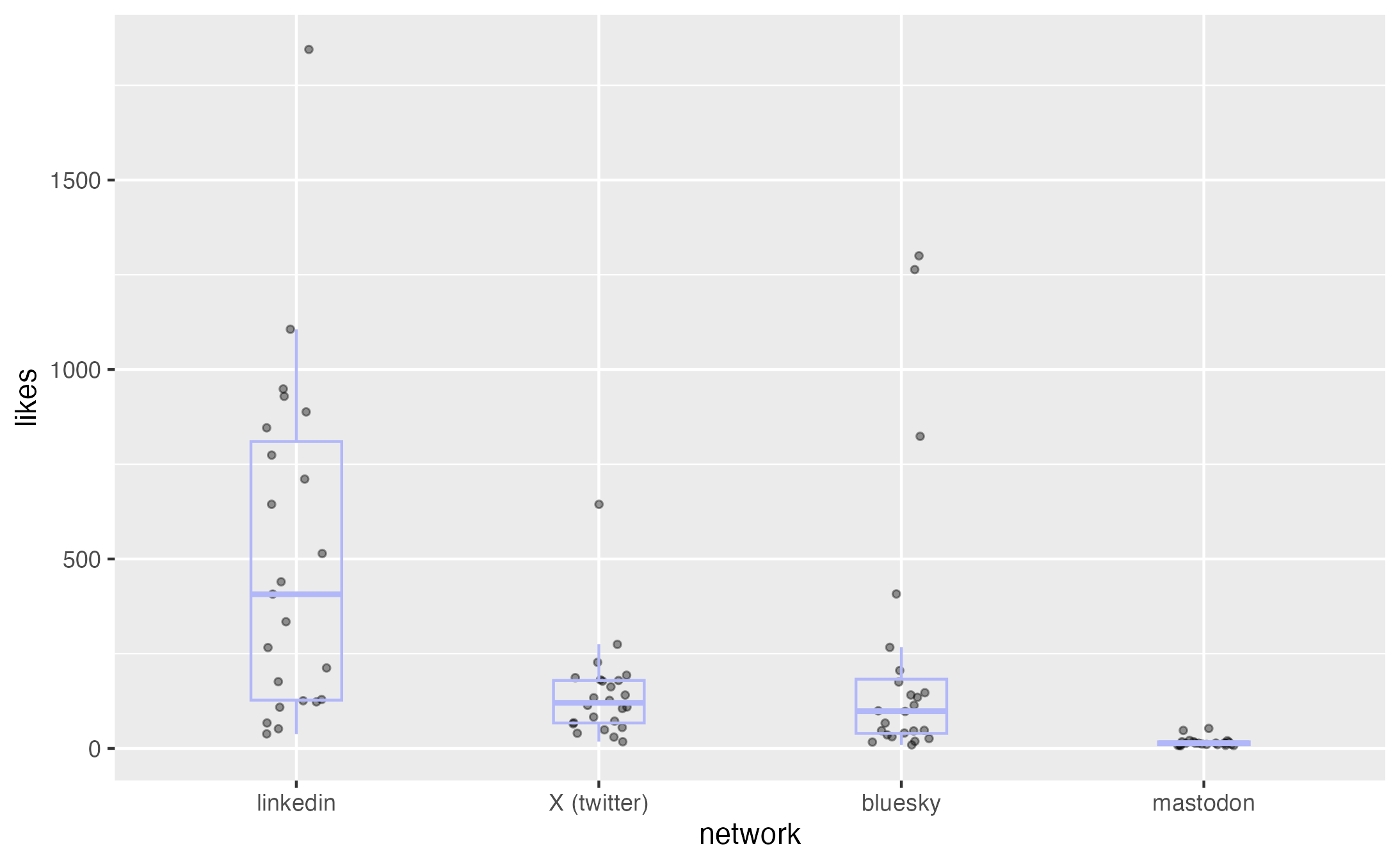 That's looking at the data, how might I interpret this in terms of the importance of the services? Of the three I'm more inclined to value the reposts - after all that is someone thinking the that post is valuable enough to send out to their own followers. That indicates a clear pecking order with LinkedIn > X > Bluesky > Mastodon. It's interesting that LinkedIn is a more singular leader on likes, it seems both higher itself and X is lower. I guess that means LinkedIn people are more eager to hit the like button.