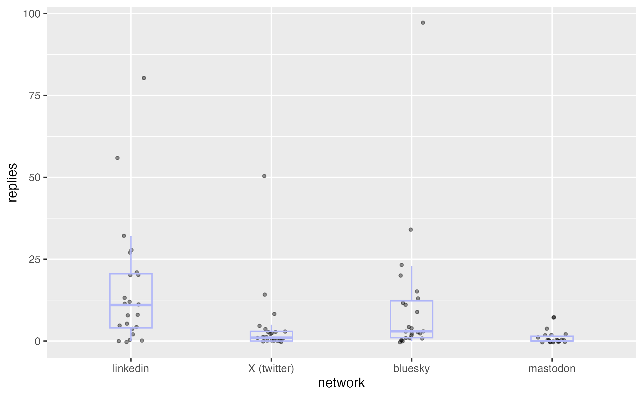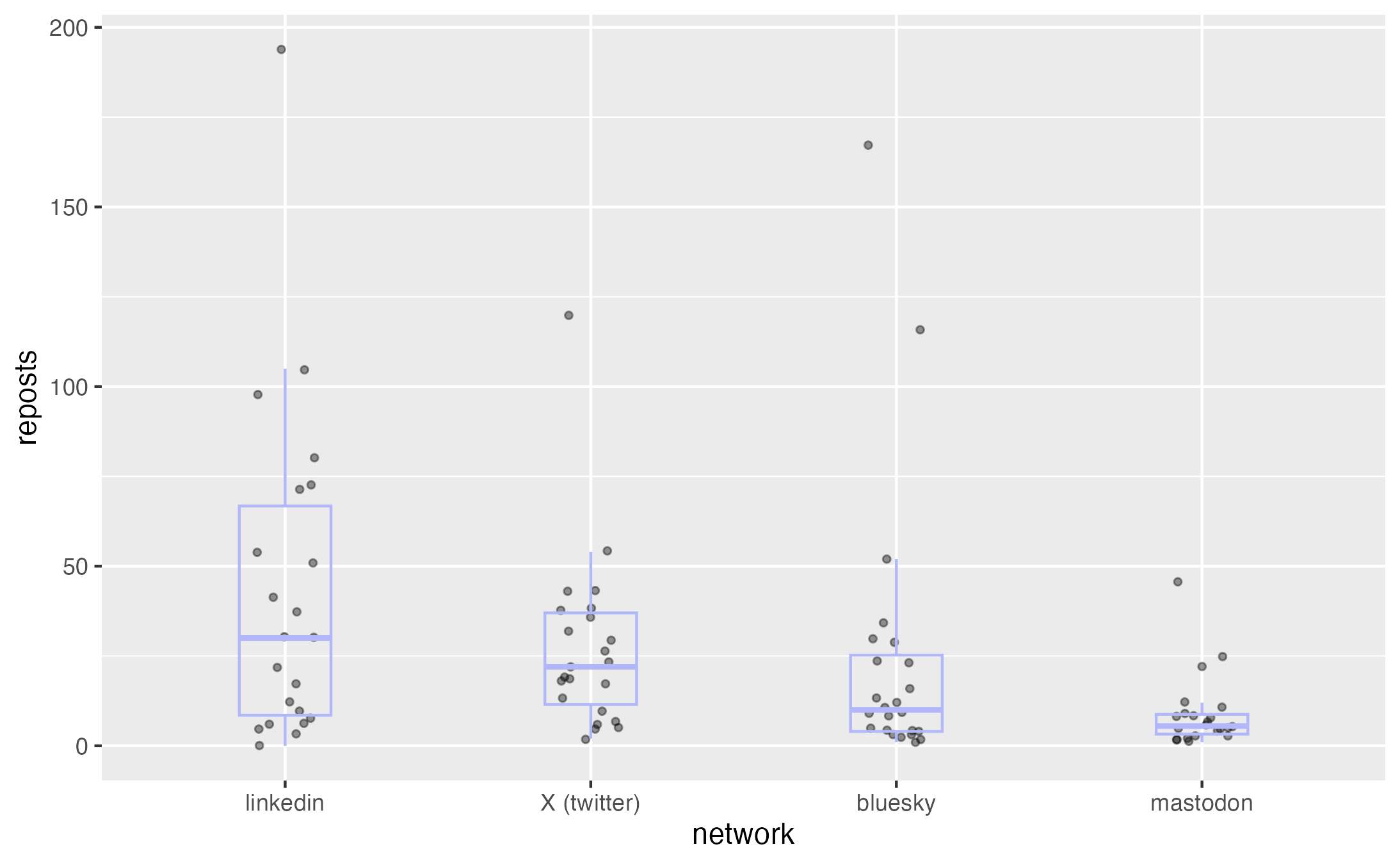 With replies LinkedIn is again clearly averaging more, but bluesky does have a significant number of heavily replied posts that push its upper quartile far above the other two services.