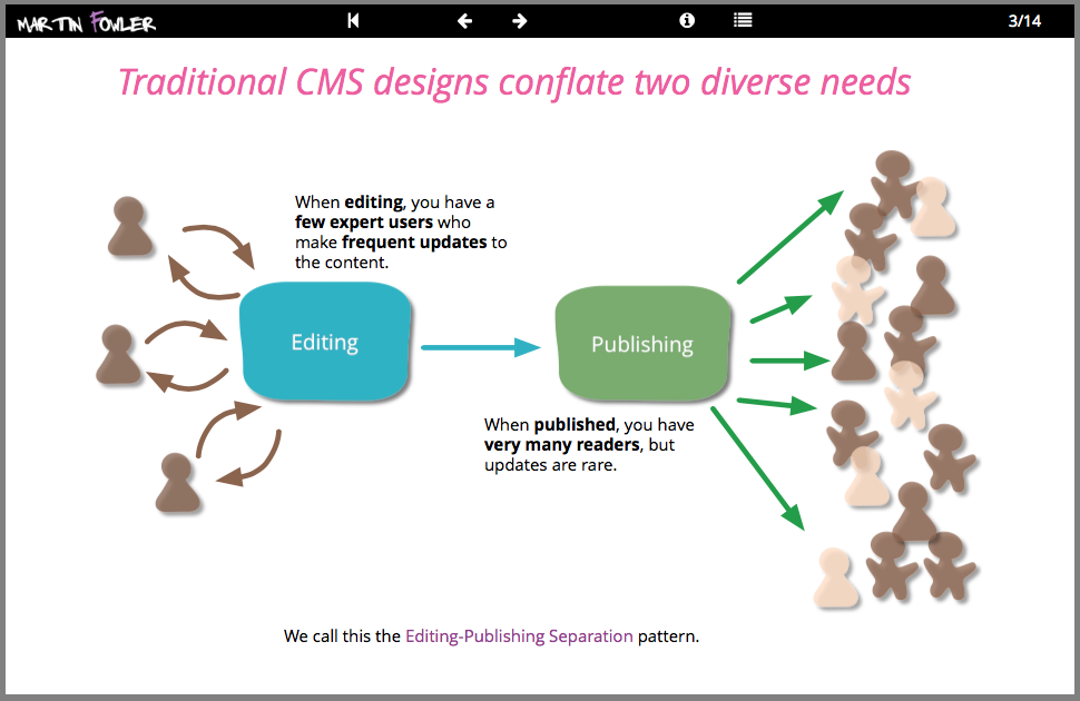 We build many websites with rich content, often using popular Content Management Systems (CMS). A recent project involved a marketing website for a global manufacturer which demanded complex interactive content with high availability and traffic needs. Our response was to apply the editing-publishing separation pattern and build two distinct stacks of software for content creation and delivery. In this deck you can see an overview of this architecture and our response to the issues of integration between the stacks, providing a secure preview of the live site, and handling the evolution and scaling of the system.