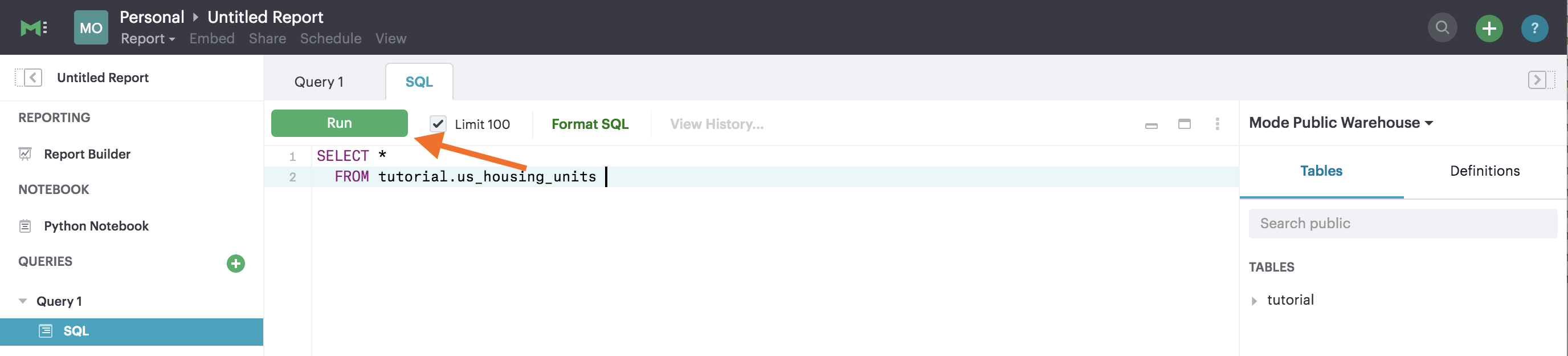 This will take you to the Query Editor. This is the bread and butter of Mode—it's where you'll be able to use all the skills you learn in this tutorial. From the Query Editor, you can run queries against all of the data in Mode.