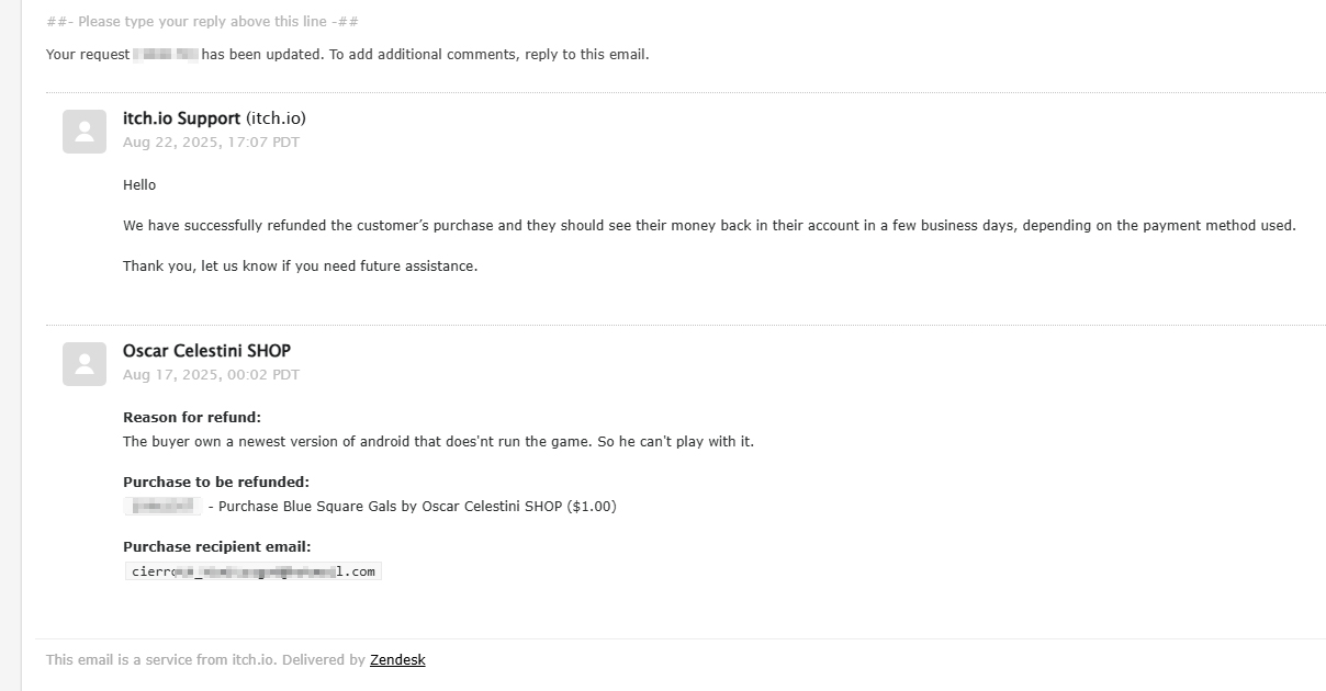 I'm again eheh, I sent a request for refund for you, I think is possible, but we have to wait the answer from itch. I'll be online for news and I'll back here once received feedback from them.