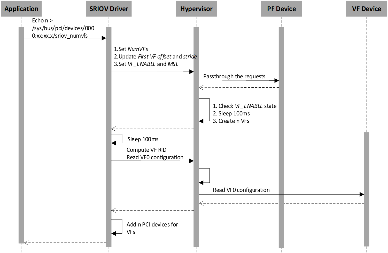 The application enables n VF devices via an SR-IOV PF device sysfs node. The hypervisor intercepts all SR-IOV capability access and checks the VF_ENABLE state. If VF_ENABLE is set, the hypervisor creates n virtual devices after 100ms so that VF physical devices have enough time to be created. The Service VM waits 100ms and then only accesses the first VF device’s configuration space including Class Code, Reversion ID, Subsystem Vendor ID, Subsystem ID. The Service VM uses the first VF device information to initialize subsequent VF devices.