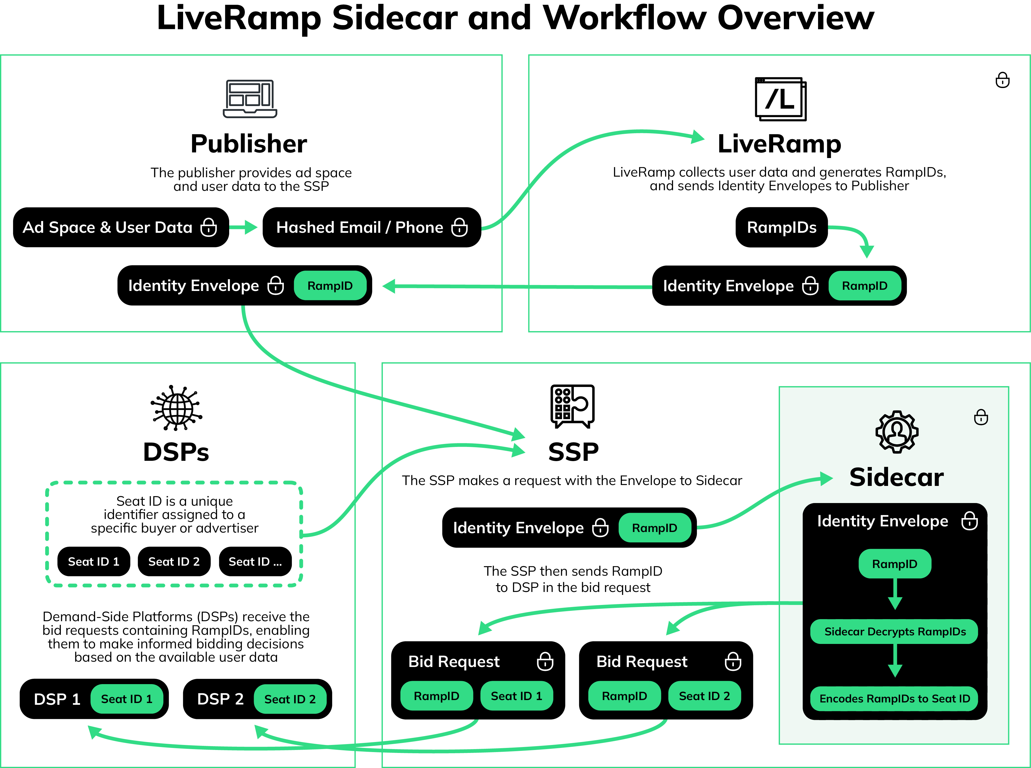 The LiveRamp Sidecar enables RampIDs (previously known as IdentityLinks or IDLs) and other people-based IDs in real-time bidding (RTB) bid requests for Supply-Side Platforms (SSPs). The Sidecar allows an SSP to decrypt the identity Envelopes LiveRamp has provided them into Demand-Side Platform-specific RampIDs and other people-based identifiers that can be utilized for identification purposes of the underlying browser in RTB bid requests. No communication with LiveRamp is required at impression time, enabling low-latency usage of the Sidecar.